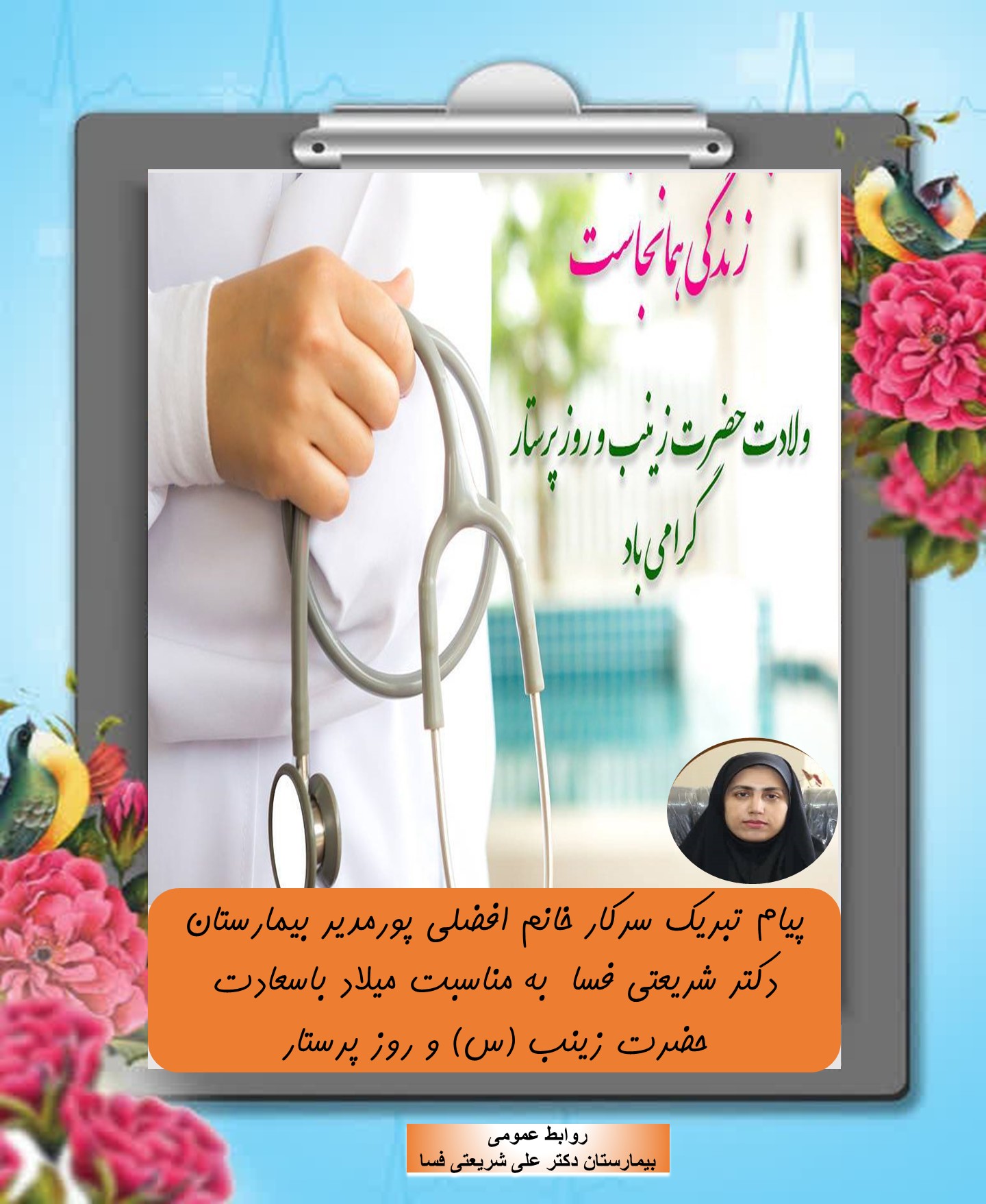 مدیر بیمارستان دکتر علی شریعتی فسا در پیامی با گرامیداشت ولادت با سعادت حضرت زینب کبری سلام الله علیها و روز پرستار، از آنان که با دستانی سرشار از مهر و قلبی مملو از ایمان به بیماران خدمت می کنند قدردانی کرد.